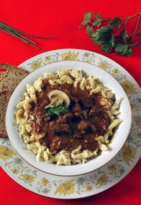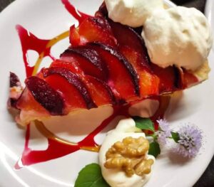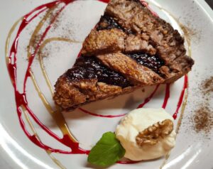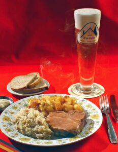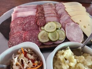 Se ofrecen varios platos de la gastronomía alemana y centroeuropea, pastas caseras, ensaladas, cerveza tirada de barril y repostería austríaca. En verano también minutas y parrilla.
