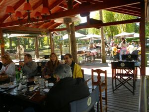 Se puede almorzar en hermosos decks de madera frente al río, en sus hermosos y cuidados jardines, en el quincho o en un salón bávaro con calefacción o aire acondicionado en primer piso.
